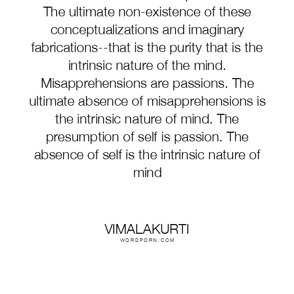 Passions consist of conceptualizations. The ultimate non-existence of these conceptualizations and imaginary fabrications--that is the purity that is the intrinsic nature of the mind. Misapprehensions are passions. The ultimate absence of misapprehensions is the intrinsic nature of mind. The presumption of self is passion. The absence of self is the intrinsic nature of mind