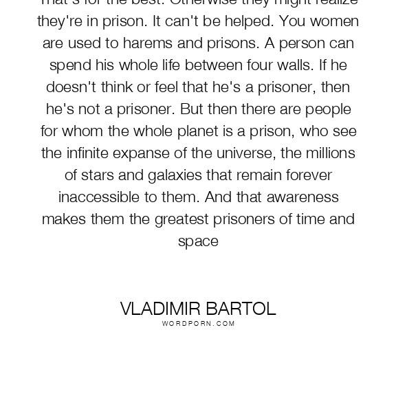 Vladimir Bartol quote. That's for the best. Otherwise they might realize they're in prison. It can't be helped. You women are used to harems and prisons. A person can spend his whole life between four walls. If he doesn't think or feel that he's a prisoner, then he's not a prisoner. But then there are people for whom the whole planet is a prison, who see the infinite expanse of the universe, the millions of stars and galaxies that remain forever inaccessible to them. And that awareness makes them the greatest prisoners of time and space