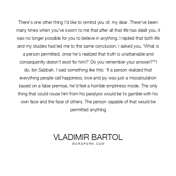 Vladimir Bartol quote. There's one other thing I'd like to remind you of, my dear. There've been many times when you've sworn to me that after all that life has dealt you, it was no longer possible for you to believe in anything. I replied that both life and my studies had led me to the same conclusion. I asked you, 'What is a person permitted, once he's realized that truth is unattainable and consequently doesn't exist for him?' Do you remember your answer?