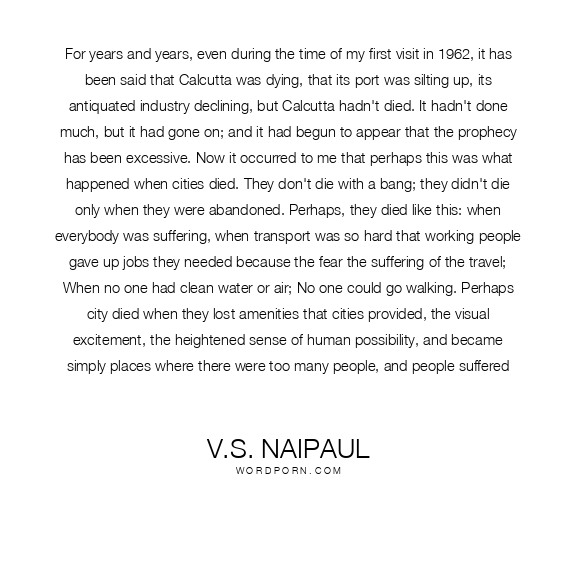 For years and years, even during the time of my first visit in 1962, it has been said that Calcutta was dying, that its port was silting up, its antiquated industry declining, but Calcutta hadn't died. It hadn't done much, but it had gone on; and it had begun to appear that the prophecy has been excessive. Now it occurred to me that perhaps this was what happened when cities died. They don't die with a bang; they didn't die only when they were abandoned. Perhaps, they died like this: when everybody was suffering, when transport was so hard that working people gave up jobs they needed because the fear the suffering of the travel; When no one had clean water or air; No one could go walking. Perhaps city died when they lost amenities that cities provided, the visual excitement, the heightened sense of human possibility, and became simply places where there were too many people, and people suffered