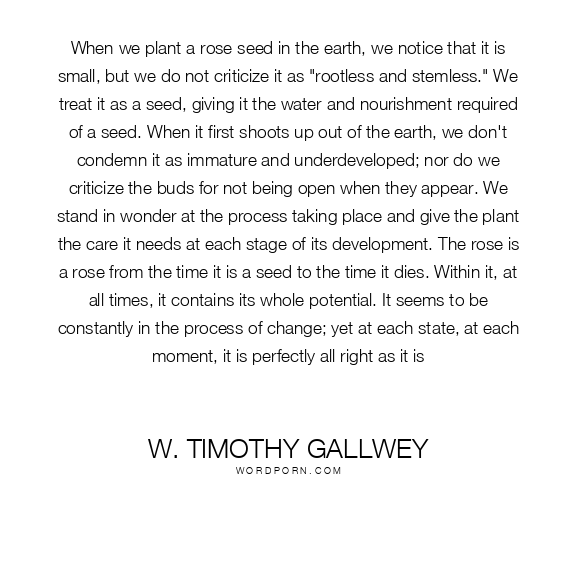 When we plant a rose seed in the earth, we notice that it is small, but we do not criticize it as "rootless and stemless." We treat it as a seed, giving it the water and nourishment required of a seed. When it first shoots up out of the earth, we don't condemn it as immature and underdeveloped; nor do we criticize the buds for not being open when they appear. We stand in wonder at the process taking place and give the plant the care it needs at each stage of its development. The rose is a rose from the time it is a seed to the time it dies. Within it, at all times, it contains its whole potential. It seems to be constantly in the process of change; yet at each state, at each moment, it is perfectly all right as it is