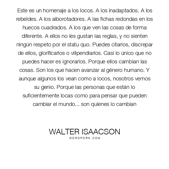 Este es un homenaje a los locos. A los inadaptados. A los rebeldes. A los alborotadores. A las fichas redondas en los huecos cuadrados. A los que ven las cosas de forma diferente. A ellos no les gustan las reglas, y no sienten ningún respeto por el statu quo. Puedes citarlos, discrepar de ellos, glorificarlos o vilipendiarlos. Casi lo único que no puedes hacer es ignorarlos. Porque ellos cambian las cosas. Son los que hacen avanzar al género humano. Y aunque algunos los vean como a locos, nosotros vemos su genio. Porque las personas que están lo suficientemente locas como para pensar que pueden cambiar el mundo... son quienes lo cambian