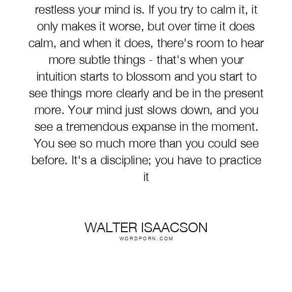 If you just sit and observe, you will see how restless your mind is. If you try to calm it, it only makes it worse, but over time it does calm, and when it does, there's room to hear more subtle things - that's when your intuition starts to blossom and you start to see things more clearly and be in the present more. Your mind just slows down, and you see a tremendous expanse in the moment. You see so much more than you could see before. It's a discipline; you have to practice it