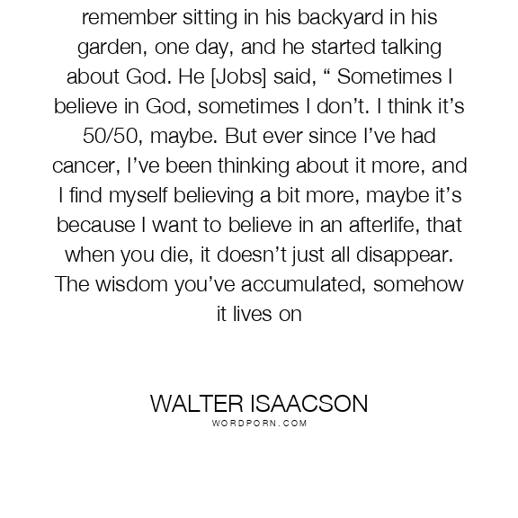Walter Issacson biographer of Steve Jobs:I remember sitting in his backyard in his garden, one day, and he started talking about God. He [Jobs] said, “ Sometimes I believe in God, sometimes I don’t. I think it’s 50/50, maybe. But ever since I’ve had cancer, I’ve been thinking about it more, and I find myself believing a bit more, maybe it’s because I want to believe in an afterlife, that when you die, it doesn’t just all disappear. The wisdom you’ve accumulated, somehow it lives on
