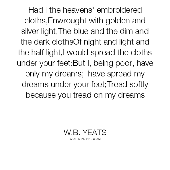 Had I the heavens' embroidered cloths,Enwrought with golden and silver light,The blue and the dim and the dark clothsOf night and light and the half light,I would spread the cloths under your feet:But I, being poor, have only my dreams;I have spread my dreams under your feet;Tread softly because you tread on my dreams