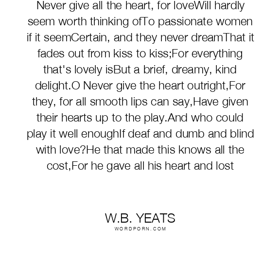 Never give all the heart, for loveWill hardly seem worth thinking ofTo passionate women if it seemCertain, and they never dreamThat it fades out from kiss to kiss;For everything that's lovely isBut a brief, dreamy, kind delight.O Never give the heart outright,For they, for all smooth lips can say,Have given their hearts up to the play.And who could play it well enoughIf deaf and dumb and blind with love?He that made this knows all the cost,For he gave all his heart and lost