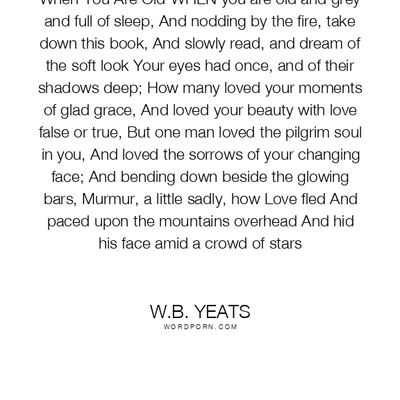 When You Are Old"WHEN you are old and grey and full of sleep, And nodding by the fire, take down this book, And slowly read, and dream of the soft look Your eyes had once, and of their shadows deep; How many loved your moments of glad grace, And loved your beauty with love false or true, But one man loved the pilgrim soul in you, And loved the sorrows of your changing face; And bending down beside the glowing bars, Murmur, a little sadly, how Love fled And paced upon the mountains overhead And hid his face amid a crowd of stars