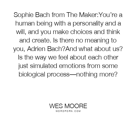 Sophie Bach from The Maker:You’re a human being with a personality and a will, and you make choices and think and create. Is there no meaning to you, Adrien Bach?And what about us? Is the way we feel about each other just simulated emotions from some biological process—nothing more?