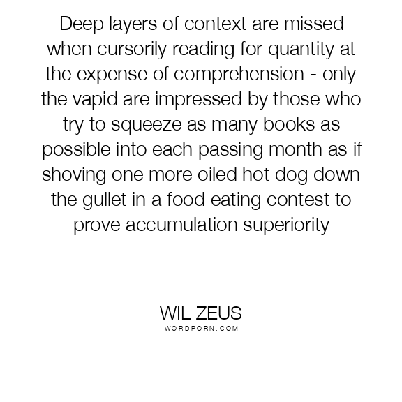 Deep layers of context are missed when cursorily reading for quantity at the expense of comprehension - only the vapid are impressed by those who try to squeeze as many books as possible into each passing month as if shoving one more oiled hot dog down the gullet in a food eating contest to prove accumulation superiority