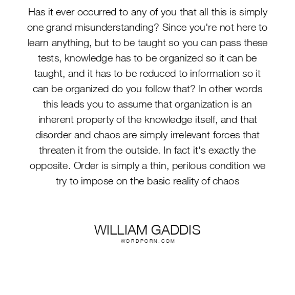 Has it ever occurred to any of you that all this is simply one grand misunderstanding? Since you're not here to learn anything, but to be taught so you can pass these tests, knowledge has to be organized so it can be taught, and it has to be reduced to information so it can be organized do you follow that? In other words this leads you to assume that organization is an inherent property of the knowledge itself, and that disorder and chaos are simply irrelevant forces that threaten it from the outside. In fact it's exactly the opposite. Order is simply a thin, perilous condition we try to impose on the basic reality of chaos