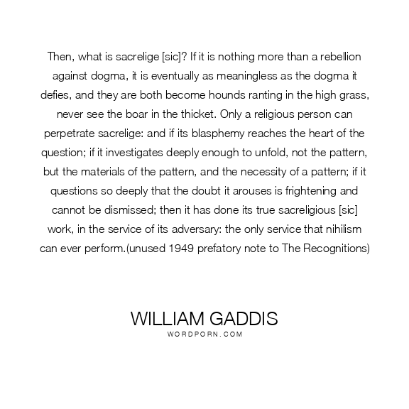 Then, what is sacrelige [sic]? If it is nothing more than a rebellion against dogma, it is eventually as meaningless as the dogma it defies, and they are both become hounds ranting in the high grass, never see the boar in the thicket. Only a religious person can perpetrate sacrelige: and if its blasphemy reaches the heart of the question; if it investigates deeply enough to unfold, not the pattern, but the materials of the pattern, and the necessity of a pattern; if it questions so deeply that the doubt it arouses is frightening and cannot be dismissed; then it has done its true sacreligious [sic] work, in the service of its adversary: the only service that nihilism can ever perform.(unused 1949 prefatory note to The Recognitions)