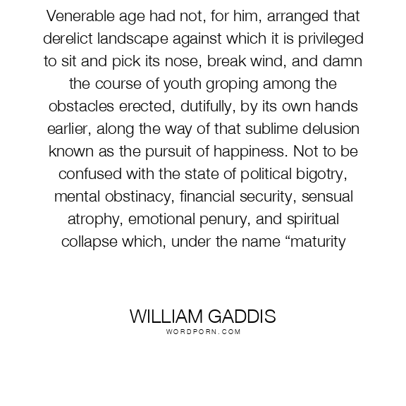 Venerable age had not, for him, arranged that derelict landscape against which it is privileged to sit and pick its nose, break wind, and damn the course of youth groping among the obstacles erected, dutifully, by its own hands earlier, along the way of that sublime delusion known as the pursuit of happiness. Not to be confused with the state of political bigotry, mental obstinacy, financial security, sensual atrophy, emotional penury, and spiritual collapse which, under the name “maturity