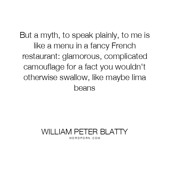 But a myth, to speak plainly, to me is like a menu in a fancy French restaurant: glamorous, complicated camouflage for a fact you wouldn't otherwise swallow, like maybe lima beans
