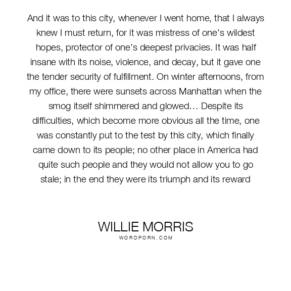 And it was to this city, whenever I went home, that I always knew I must return, for it was mistress of one's wildest hopes, protector of one's deepest privacies. It was half insane with its noise, violence, and decay, but it gave one the tender security of fulfillment. On winter afternoons, from my office, there were sunsets across Manhattan when the smog itself shimmered and glowed… Despite its difficulties, which become more obvious all the time, one was constantly put to the test by this city, which finally came down to its people; no other place in America had quite such people and they would not allow you to go stale; in the end they were its triumph and its reward