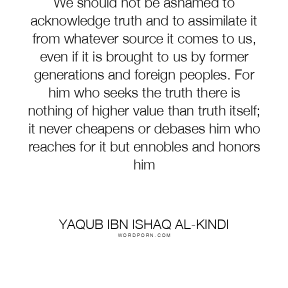 We should not be ashamed to acknowledge truth and to assimilate it from whatever source it comes to us, even if it is brought to us by former generations and foreign peoples. For him who seeks the truth there is nothing of higher value than truth itself; it never cheapens or debases him who reaches for it but ennobles and honors him