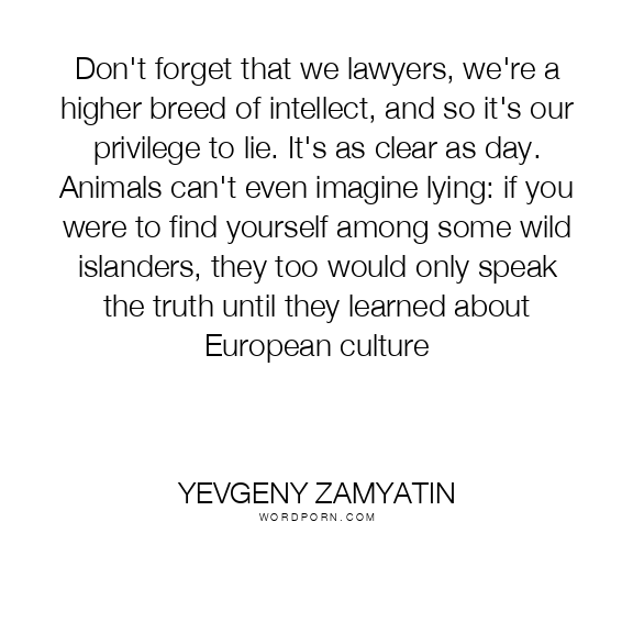 Don't forget that we lawyers, we're a higher breed of intellect, and so it's our privilege to lie. It's as clear as day. Animals can't even imagine lying: if you were to find yourself among some wild islanders, they too would only speak the truth until they learned about European culture