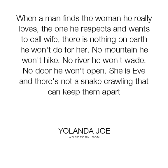 When a man finds the woman he really loves, the one he respects and wants to call wife, there is nothing on earth he won't do for her. No mountain he won't hike. No river he won't wade. No door he won't open. She is Eve and there's not a snake crawling that can keep them apart