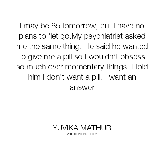 I may be 65 tomorrow, but i have no plans to 'let go.My psychiatrist asked me the same thing. He said he wanted to give me a pill so I wouldn’t obsess so much over momentary things. I told him I don’t want a pill. I want an answer