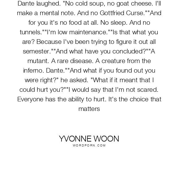Dante laughed. "No cold soup, no goat cheese. I'll make a mental note. And no Gottfried Curse.""And for you it's no food at all. No sleep. And no tunnels.""I'm low maintenance.""Is that what you are? Because I've been trying to figure it out all semester.""And what have you concluded?""A mutant. A rare disease. A creature from the inferno. Dante.""And what if you found out you were right?" he asked. "What if it meant that I could hurt you?""I would say that I'm not scared. Everyone has the ability to hurt. It's the choice that matters