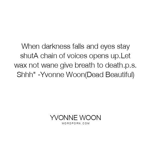 When darkness falls and eyes stay shutA chain of voices opens up.Let wax not wane give breath to death.p.s. Shhh" -Yvonne Woon(Dead Beautiful)