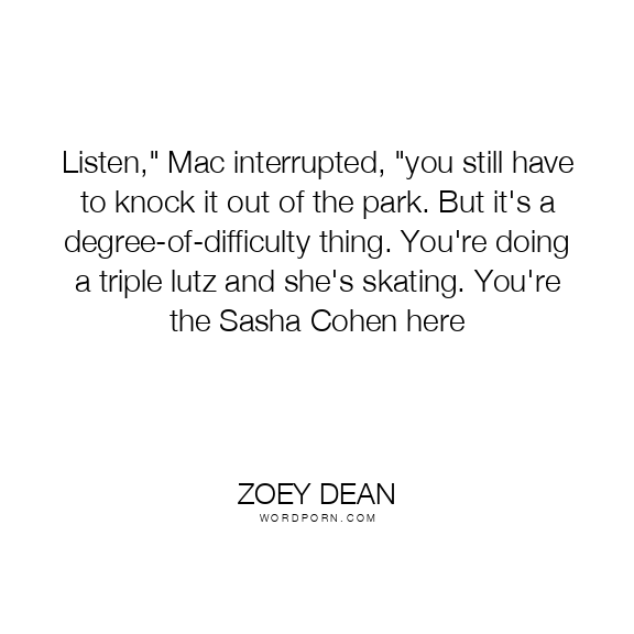 Listen," Mac interrupted, "you still have to knock it out of the park. But it's a degree-of-difficulty thing. You're doing a triple lutz and she's skating. You're the Sasha Cohen here