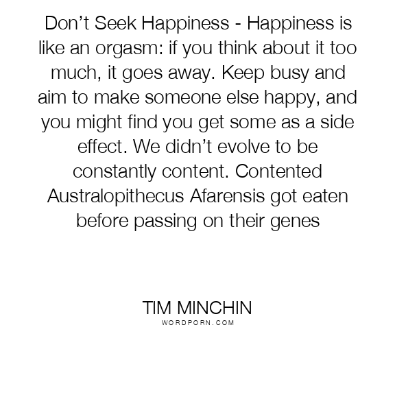 Don’t Seek Happiness - Happiness is like an orgasm: if you think about it too much, it goes away. Keep busy and aim to make someone else happy, and you might find you get some as a side effect. We didn’t evolve to be constantly content. Contented Australopithecus Afarensis got eaten before passing on their genes