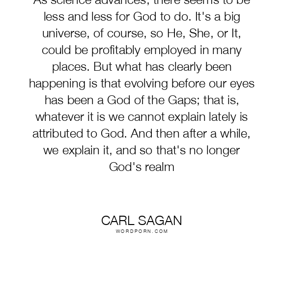 As science advances, there seems to be less and less for God to do. It's a big universe, of course, so He, She, or It, could be profitably employed in many places. But what has clearly been happening is that evolving before our eyes has been a God of the Gaps; that is, whatever it is we cannot explain lately is attributed to God. And then after a while, we explain it, and so that's no longer God's realm