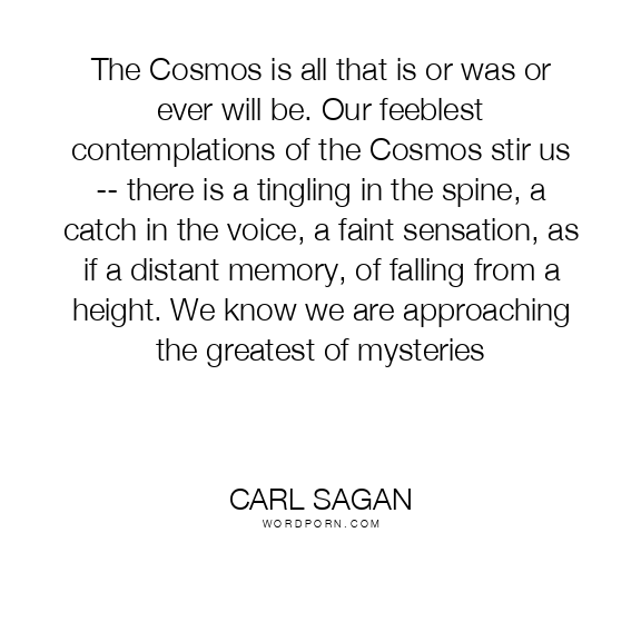 The Cosmos is all that is or was or ever will be. Our feeblest contemplations of the Cosmos stir us -- there is a tingling in the spine, a catch in the voice, a faint sensation, as if a distant memory, of falling from a height. We know we are approaching the greatest of mysteries