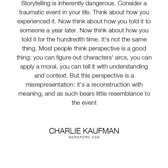 Storytelling is inherently dangerous. Consider a traumatic event in your life. Think about how you experienced it. Now think about how you told it to someone a year later. Now think about how you told it for the hundredth time. It's not the same thing. Most people think perspective is a good thing: you can figure out characters' arcs, you can apply a moral, you can tell it with understanding and context. But this perspective is a misrepresentation: it's a reconstruction with meaning, and as such bears little resemblance to the event